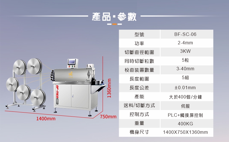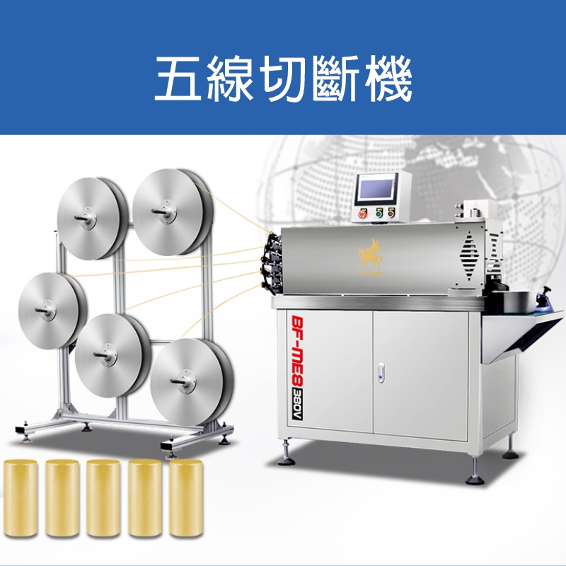 五線切斷機 ▇ 型號:BF-SC-06 適用金屬: 黃金、銀、銅、鉑、鈀、銠、鉭、鈮、鎳、鋁及其合金等金屬材料 應用行業: 蒸發料、焊料、貴金屬加工、高校研究院、新材料、半導體等行業 產品優勢: 1.精度高 -成品長度公差在±0.03mm以內 2.硬度高 -刀具采用鎢鋼或者高硬度鋼材料 3.效率高 -條線材同時工作,每分鐘產能400個以上 4.切口平整-切斷截面光滑無斜度 5.校直功能 -每條線材切斷前都有校直,以確保精度 6.操作簡單 -PLC控制系統,簡單易操作