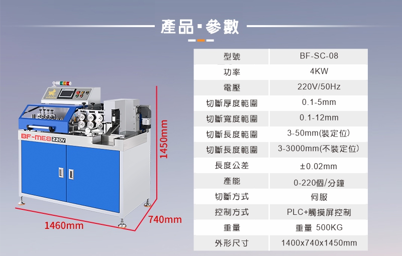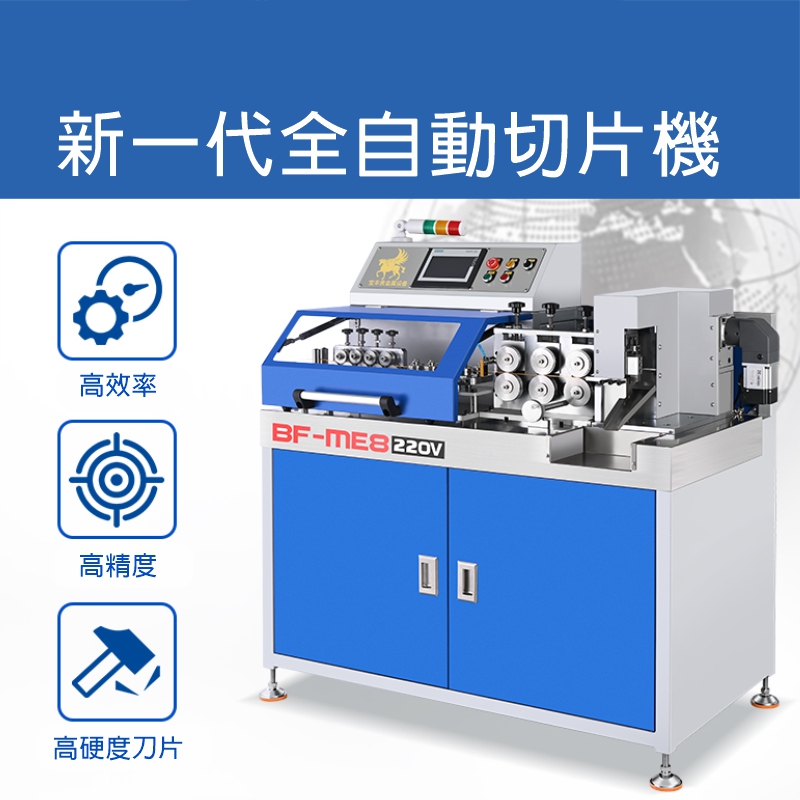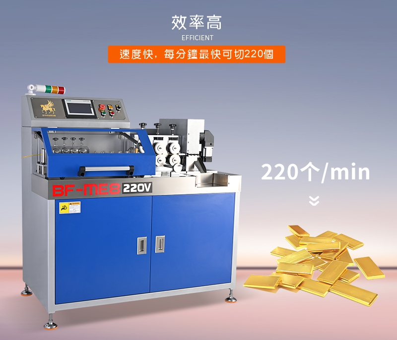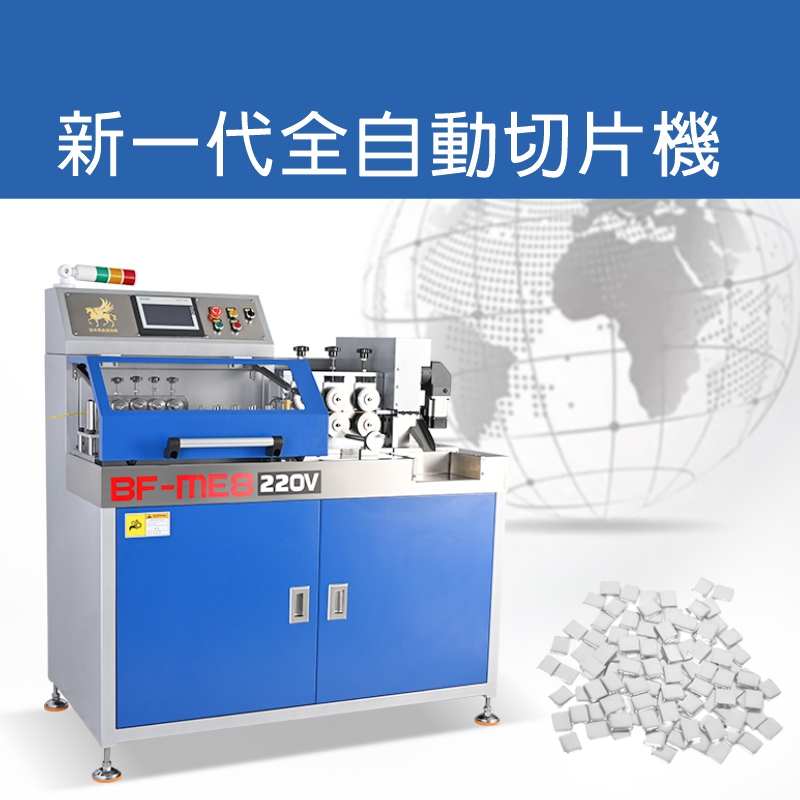 自動切片機 ▇ 型號: BF-SC-08 適用金屬: 黃金、銀、銅、鉑、鈀、銠、鉭、鈮、鎳、鋁及其合金等金屬材料 應用行業: 蒸發料、焊料、貴金屬加工、高校研究院、新材料、半導體等行業 產品優勢: 1.切口平整,重量均勻 2.智能控制,操作簡單 3.精度高,公差±0.03 4.速度快,最高可達200/分鐘 5.自動送料 6.較直裝置