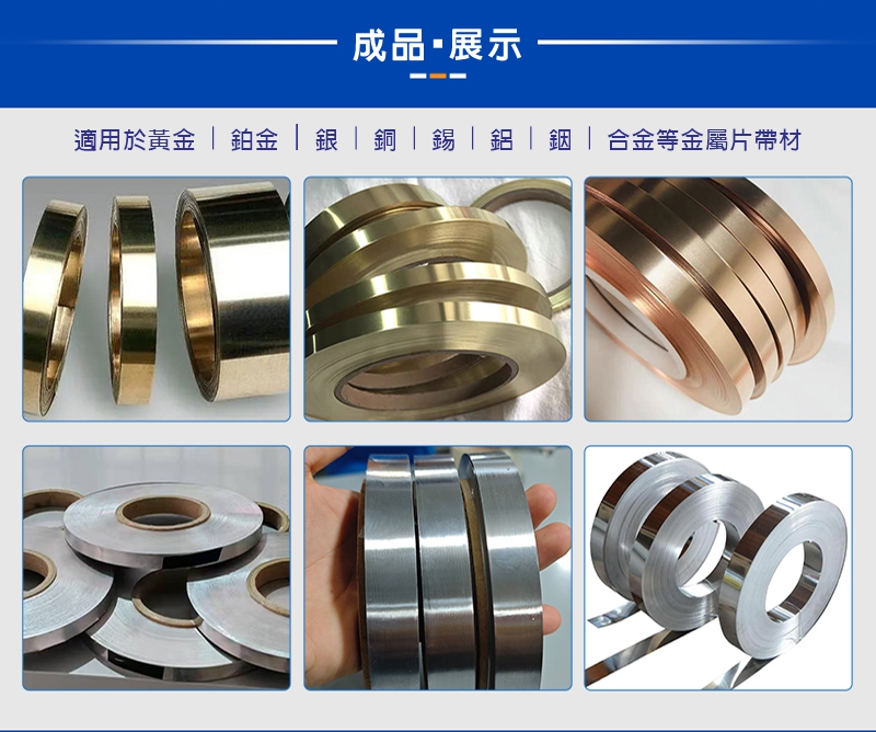 ▇ 型号:BF-SSM 適用金屬: 黃金、銀、銅、鉑、鈀、銠、錫、鋁及合金等金屬帶材 應用行業: 首飾廠家、貴金屬加工、高校實驗室、焊材焊料、新材料、電工材料等行業 產品優勢: 1.高效率,可同時分切多條金屬帶 2.高精度,切邊平整 無毛刺 無損耗 3.高硬度刀片,刀片鋒利耐用,墊片包膠不卡料 4.帶收卷裝置,高靈敏恒力裝置,收卷不斷片,配邊料收廢功能 5.自動計米,實時顯示長度及可設定所需長度 6.界面一目了然,操作簡單易用