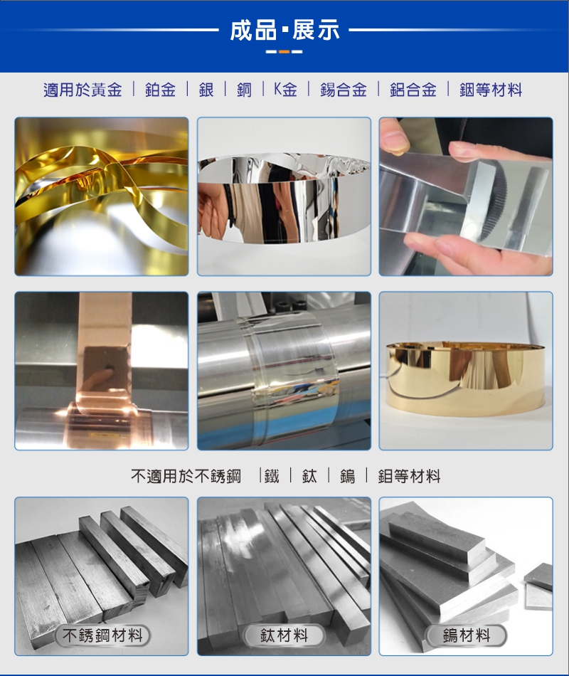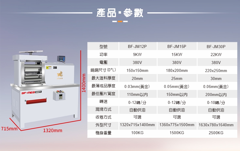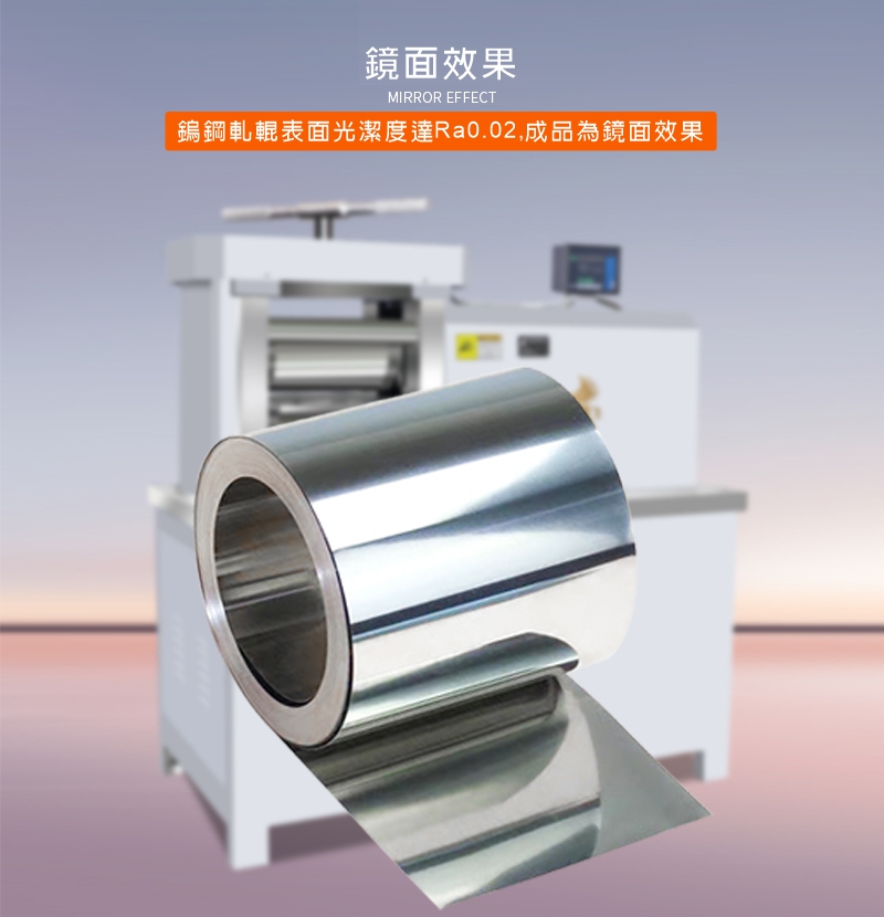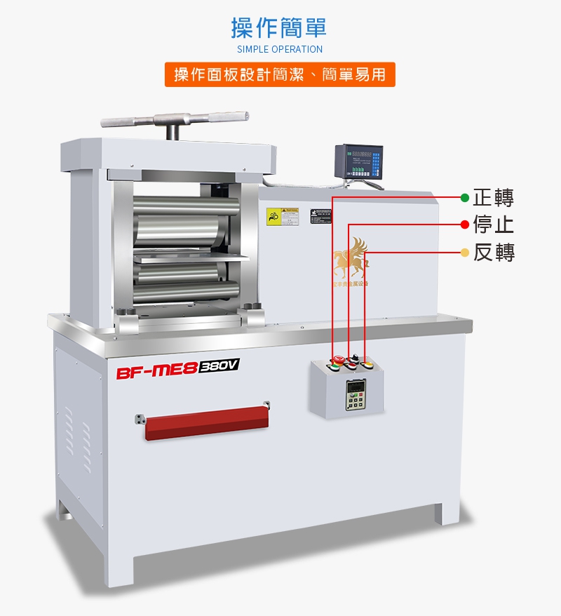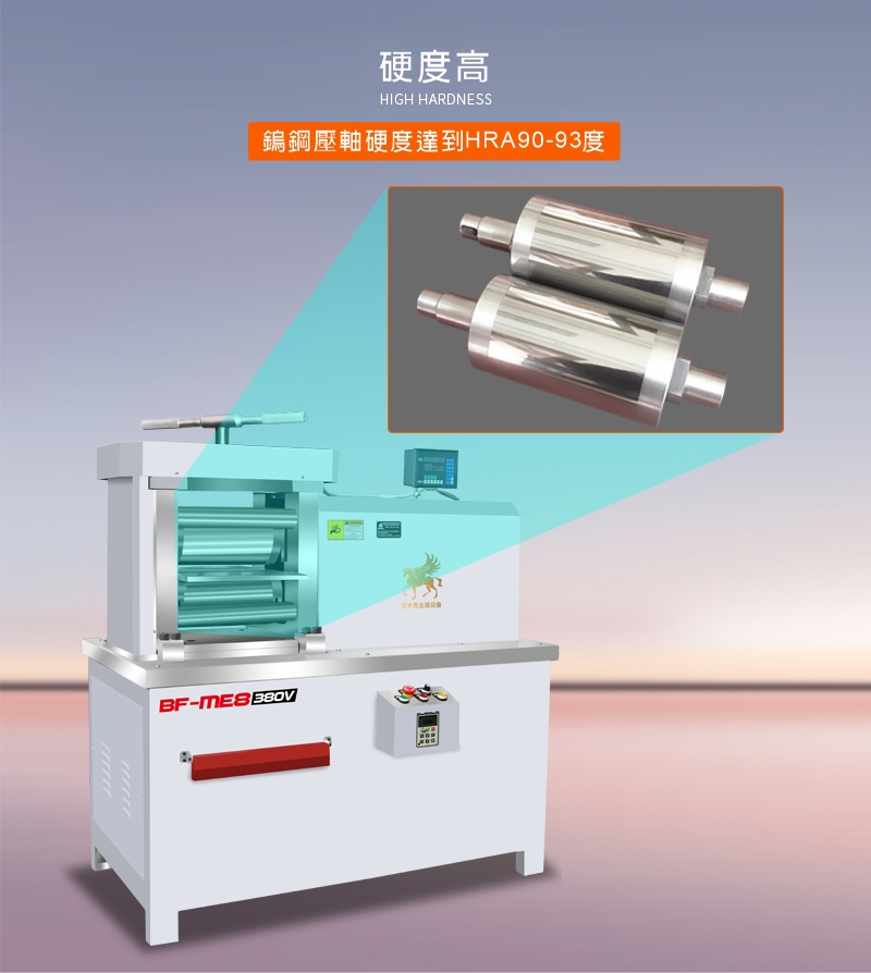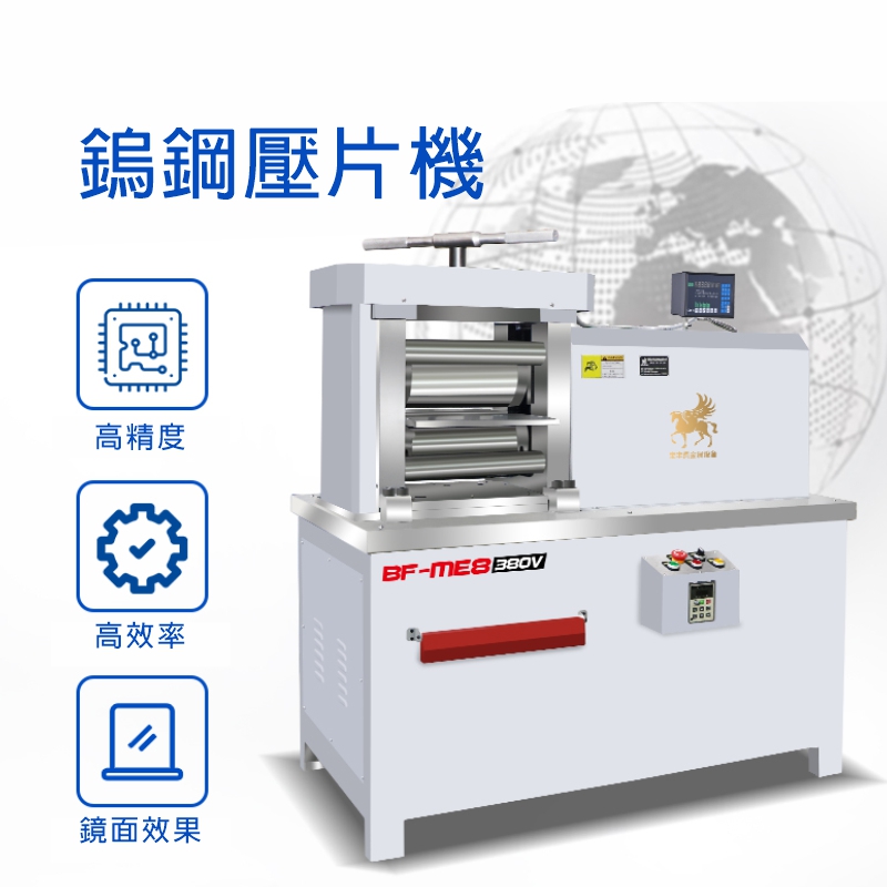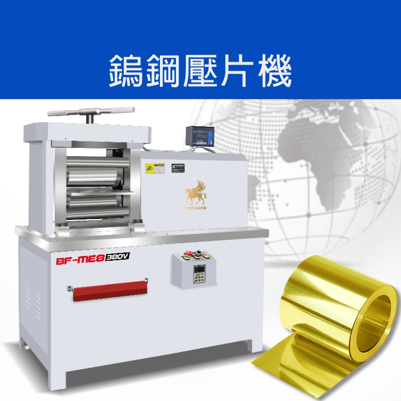 鎢鋼壓片機 ▇ 型號: BF-JM30P 適用金屬: 黃金、銀、銅、鉑、鈀、銠、錫、鋁、銦及合金等金屬材料 應用產業: 預成型焊片、貴金屬加工、大學研究院、新材料研發、電工材料、首飾廠商等行業 產品優勢: 1.鏡面效果,鎢鋼軋輥表面光潔度達Ra0.02,成品為鏡面效果 2.精度高,採用德國軸承,確保產品精度高 3.硬度高,鎢鋼壓軸硬度達HRA90-93度 4.零損耗,軋輥表面光滑,不傷片,零損耗 5.成品平直,壓軸由外圓磨精加工而成,壓出產品光亮平整 6.操作簡便,操作面板設計簡潔簡單易用