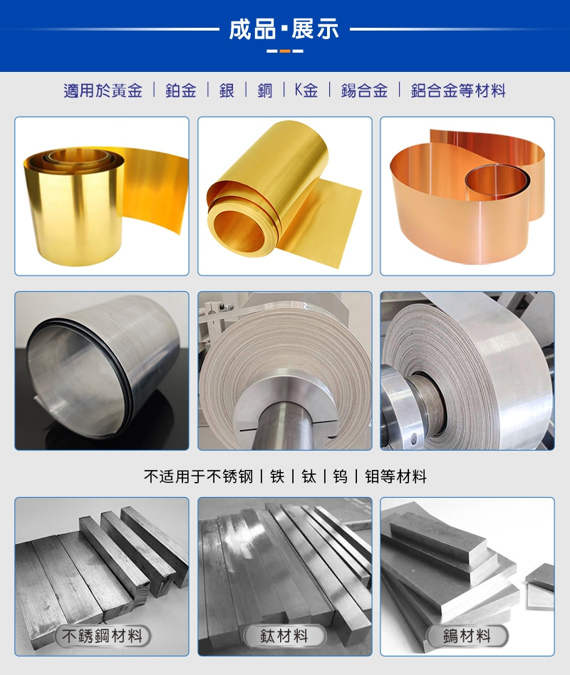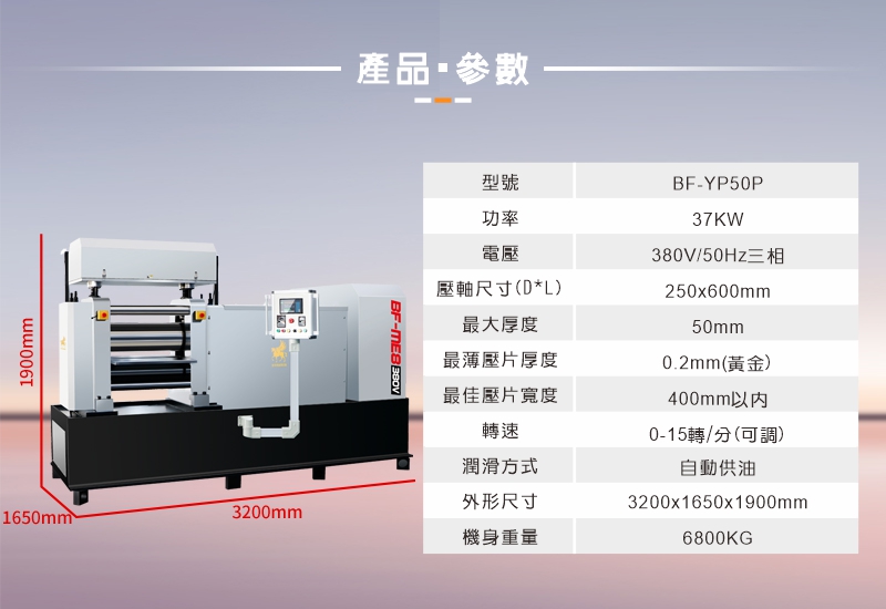 50P壓片機 ▇ 型號:BF-YP50P 適用金屬: 黃金、銀、銅、鉑、鈀、銠、錫、鋁、銦及合金等金屬材料 應用產業: 預成型焊片、貴金屬加工、大學研究院、新材料研發、電工材料、首飾廠商等行業 產品優勢: 1.成品平直,輥縫調整採用連動機構,確保成品均勻平直 2.精度高,採用德國軸承,確保產品精度高 3.硬度高,壓軸硬度達HRC63-65度 4.零損耗,軋輥表面光滑,不傷片,零損耗 5.操作簡便,操作面板設計簡潔,簡單易用 6.自動供油,設有自動供油系統,設備更耐用