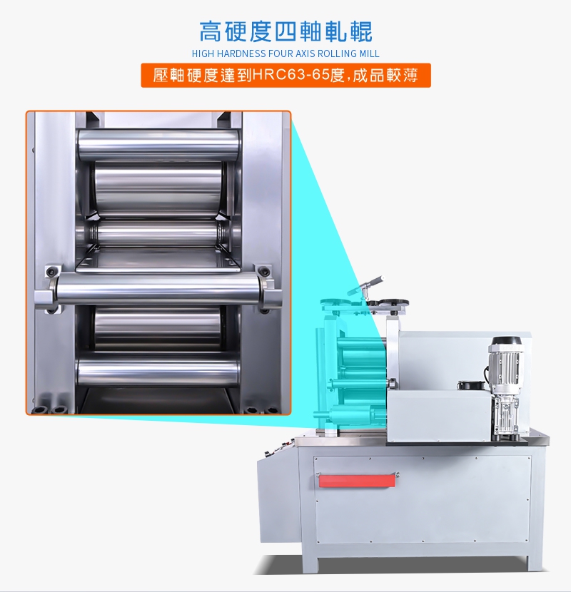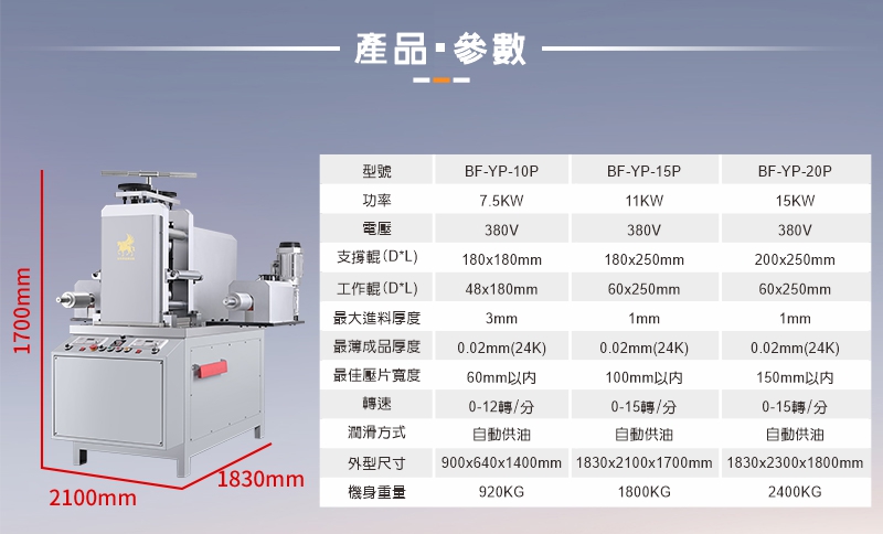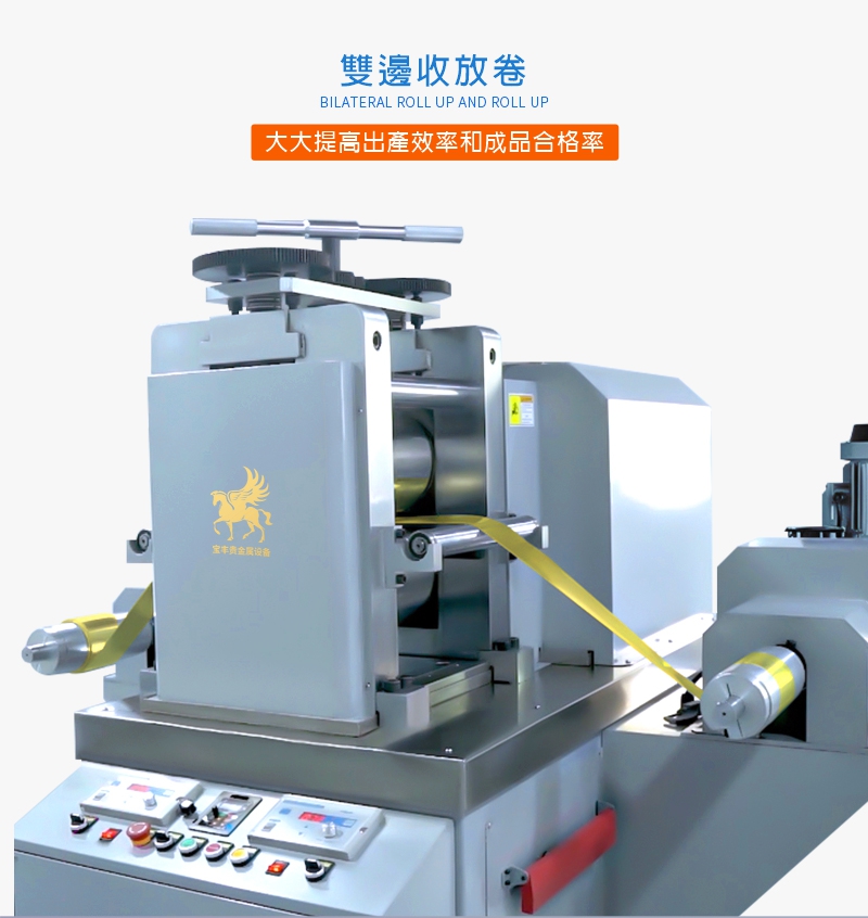 15P四軸壓片機 ▇ 型號:BF-YP-10P 適用金屬: 黃金、銀、銅、鉑、鈀、銠、錫、鋁、銦及合金等金屬材料 應用產業: 預成型焊片、貴金屬加工、大學研究院、新材料研發、電工材料、首飾廠商等行業 產品優勢: 1.高精度,四軸壓片,厚度較薄,成品可達0.01mm 2.高硬度軋輥,壓軸硬度達HRC63-65度 3.雙邊收放捲,大幅提升出產效率及成品合格率 4.操作簡單,操作面板設計簡潔,簡單易用 5.收放張力可調,採用高靈敏可調磁粉器,避免拉力過大出現片材斷裂