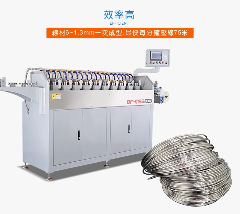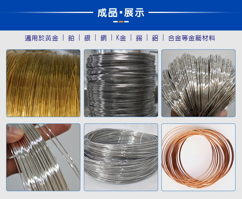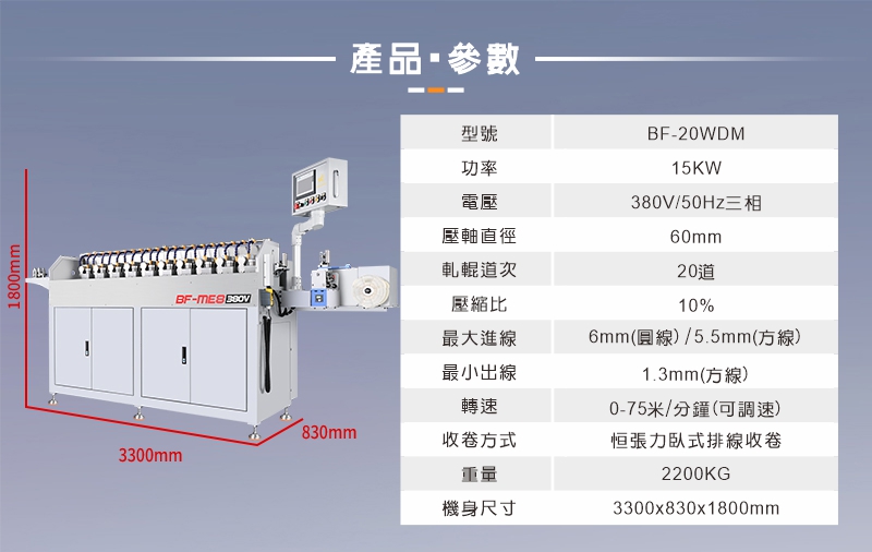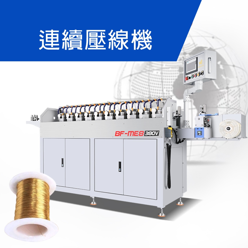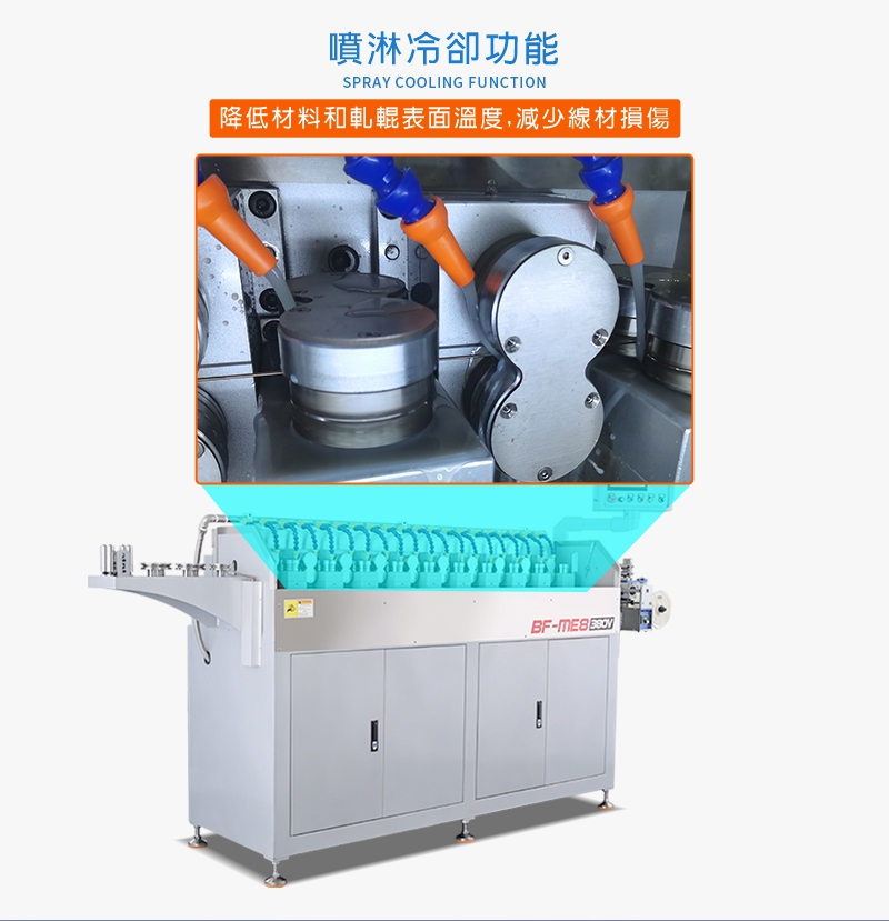 連續壓線機 ▇ 型號:BF-20WDM 適用金屬: 鉑金、鈀金、黃金、銀、銅、鋁、錫及其合金等金屬材料 應用行業: 首飾廠、貴金屬行業、焊材行業、新材料研發、電工線材等 產品優勢: 1.多組軋輥直線壓延,效率高 2.成品線無毛刺,無損耗 3.成品材質密度好,不斷線,提高壓線延展性 4.進料前較直功能,防止跑偏 5.自帶噴淋冷卻系統,降低材料和軋輥表面溫度 6.恒張力臥式排線收卷; 7.自動緊急停止裝置,缺料/完成作業時會自動停止運行