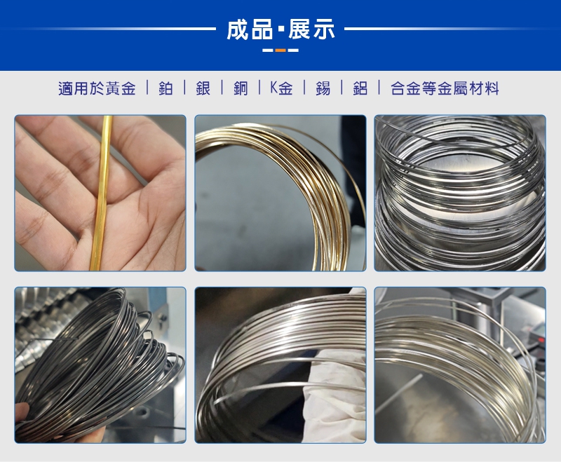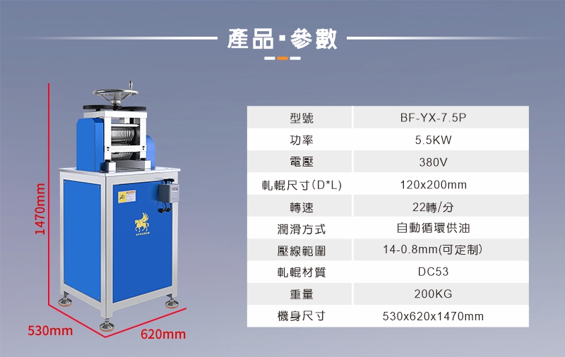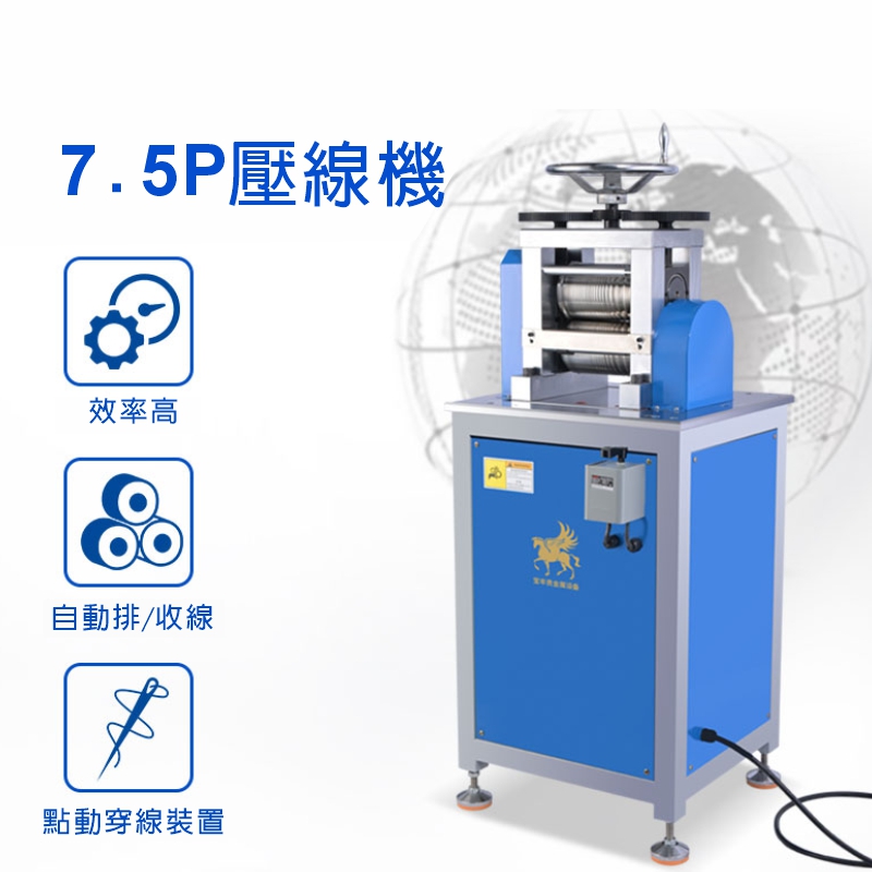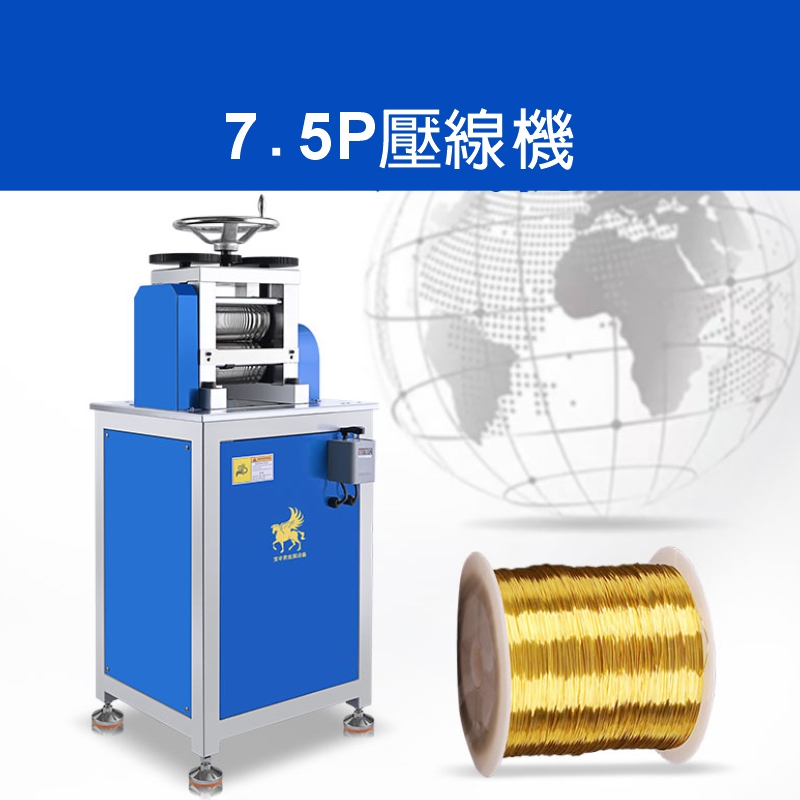 7.5P壓線機 ▇ 型號:BF-YXP-7.5P 適用金屬: 鉑金、鈀金、黃金、銀、銅、鋁、錫及其合金等金屬材料 應用行業: 首飾廠、貴金屬行業、焊材行業、新材料研發、電工線材等 產品優勢: 1.精度高,成品光滑,直徑統一,成品可達1mm 2.高硬度軋輥,壓軸硬度達到62-63HRC 3.損耗低,壓槽按精準數據開模,較大限度降低損耗 4.自動供油,減少機械磨損,延長使用壽命 5.操作簡單,簡單的機械開關設計,操作更方便 6.轉盤式聯動,可一只手調整軋輥間隙,簡單方便