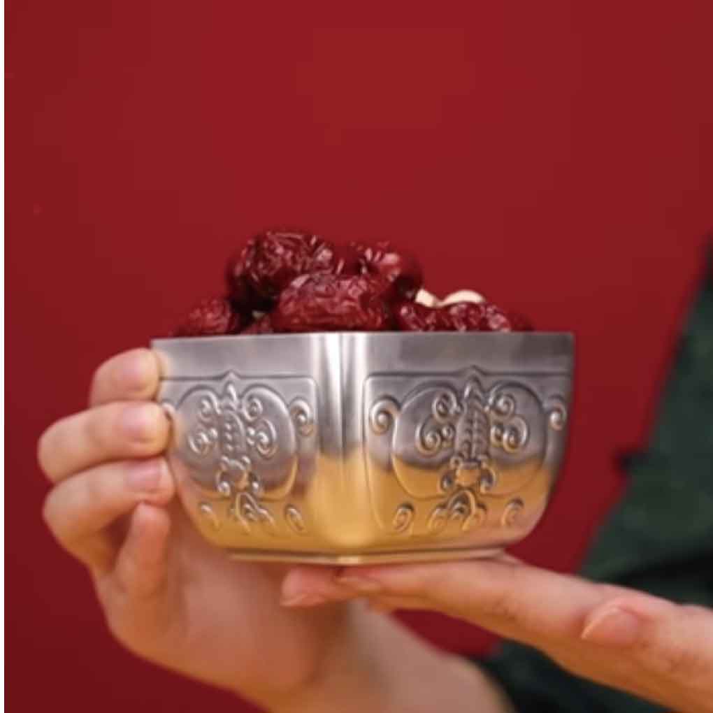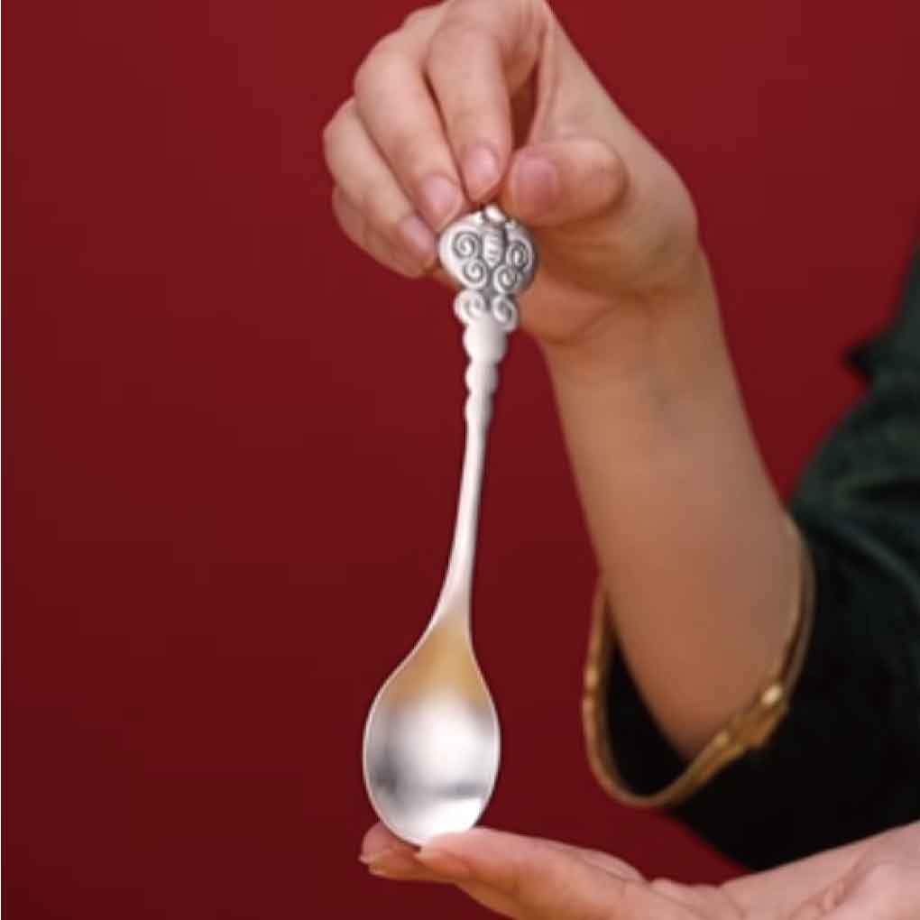 五福臨門餐具套組 材質:足銀999 克重:220克/套 工藝:仿古、浮雕 件數:3件套 https://www.bilibili.com/video/BV1aX4y1T7vM/?spm_id_from=888.80997.embed_other.whitelist&t=3.874519&bvid=BV1aX4y1T7vM