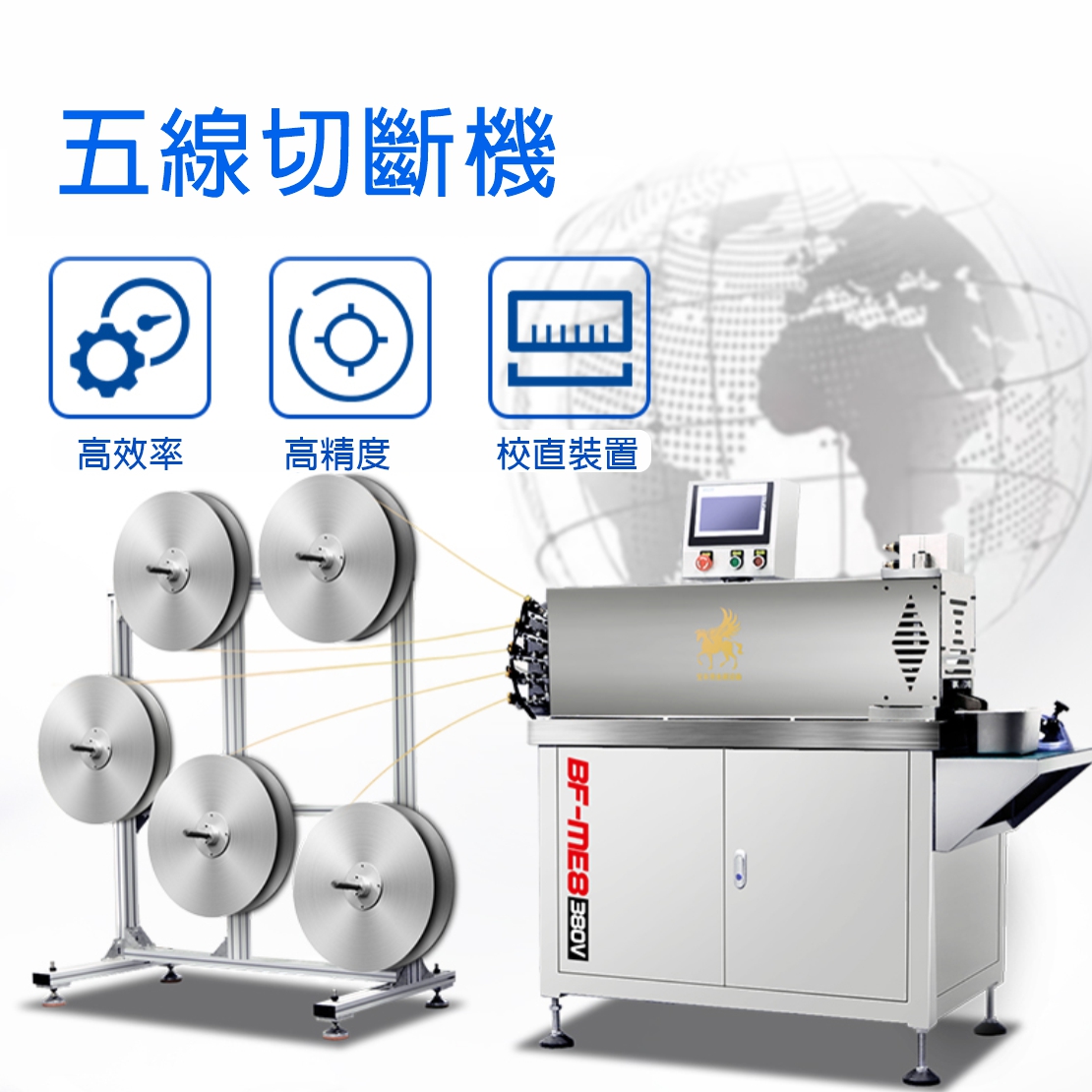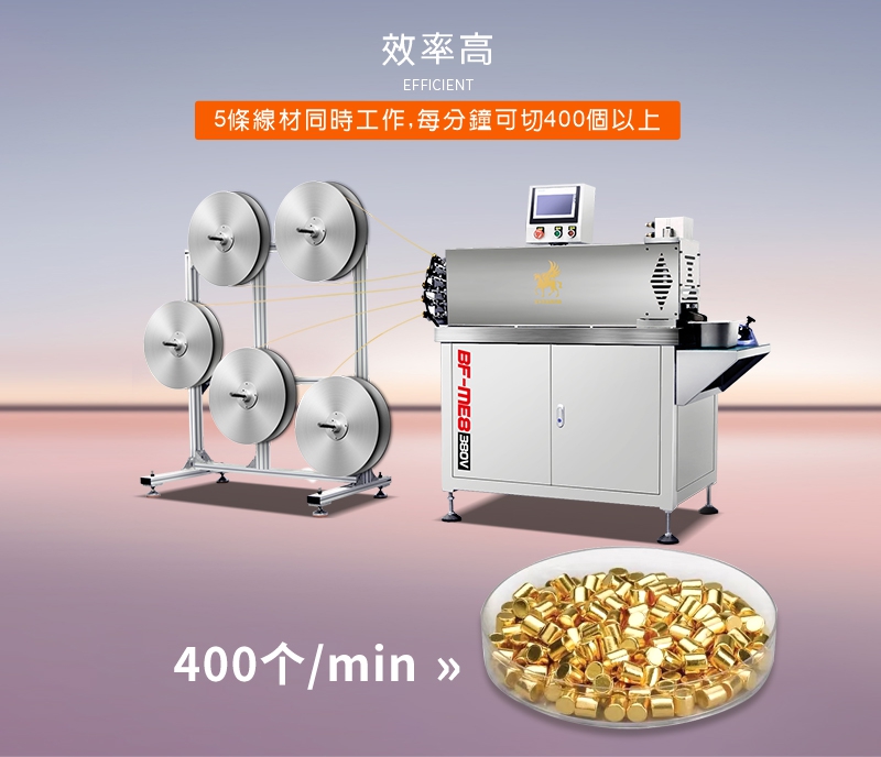 五線切斷機 ▇ 型號:BF-SC-06 適用金屬: 黃金、銀、銅、鉑、鈀、銠、鉭、鈮、鎳、鋁及其合金等金屬材料 應用行業: 蒸發料、焊料、貴金屬加工、高校研究院、新材料、半導體等行業 產品優勢: 1.精度高 -成品長度公差在±0.03mm以內 2.硬度高 -刀具采用鎢鋼或者高硬度鋼材料 3.效率高 -條線材同時工作,每分鐘產能400個以上 4.切口平整-切斷截面光滑無斜度 5.校直功能 -每條線材切斷前都有校直,以確保精度 6.操作簡單 -PLC控制系統,簡單易操作